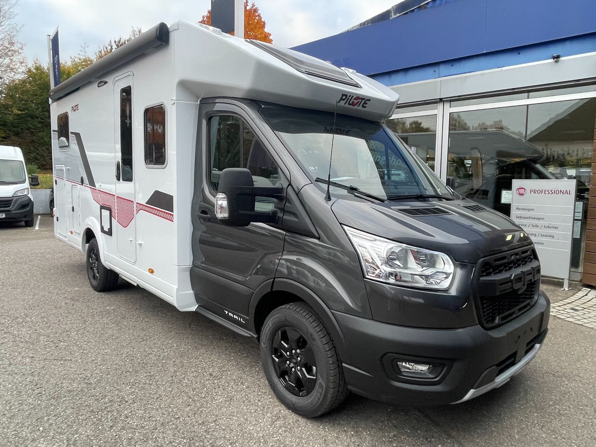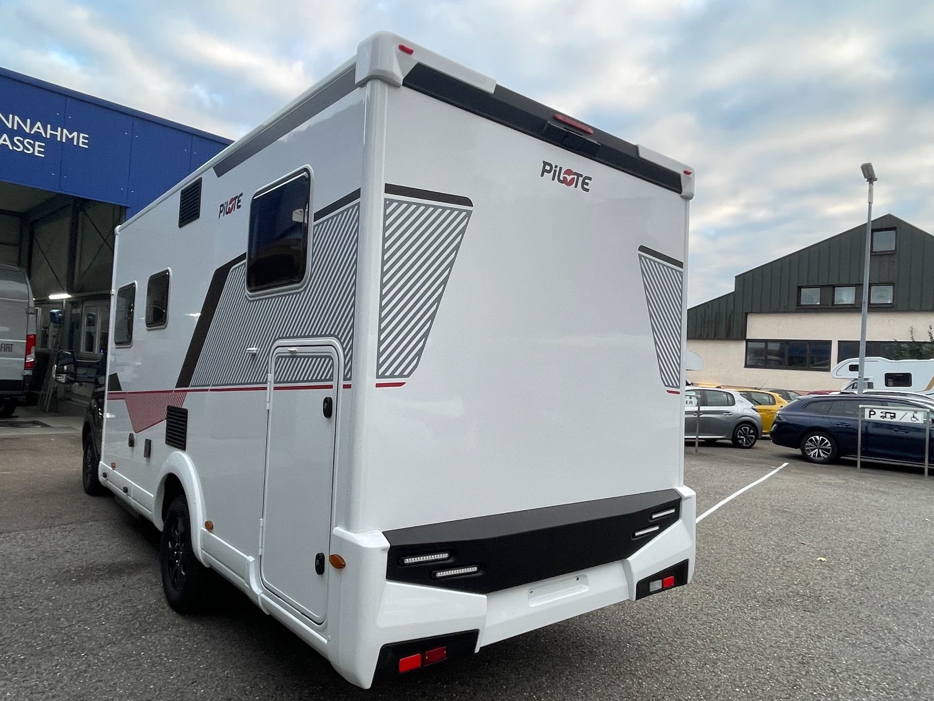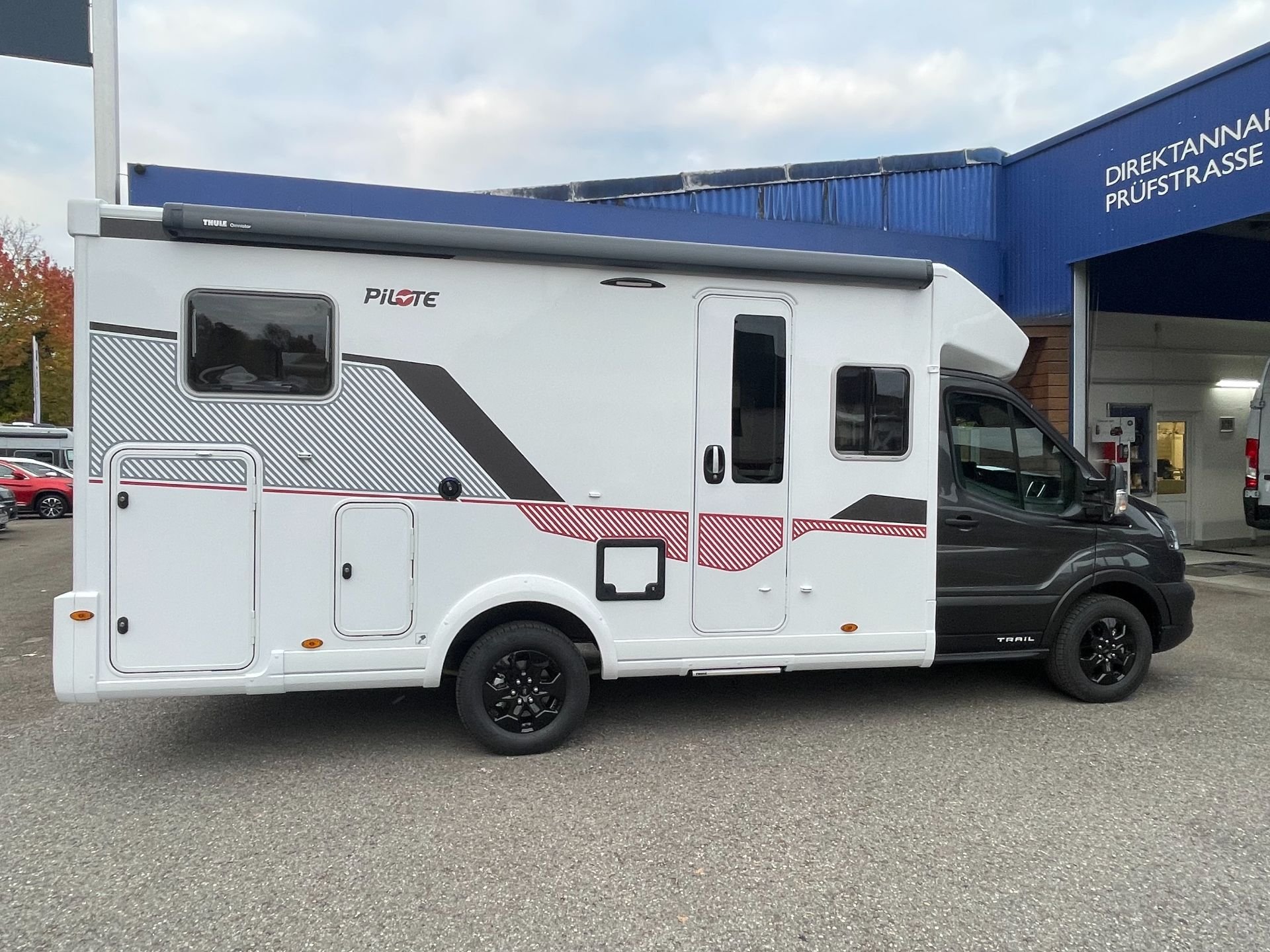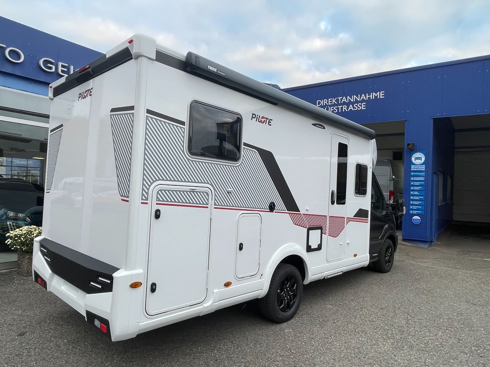 Unser Teil-Integrierter Pilote Atlas A690GJ 165 Automatik auf Ford Transit mit 7 Meter Länge, Platz für bis zu 4 Personen und toller Ausstattung wie 12" Multimediasystem , Solaranlage, , Lithium-Batterie, Rückfahrkamera, Markise und 2-fach-Fahrradträger